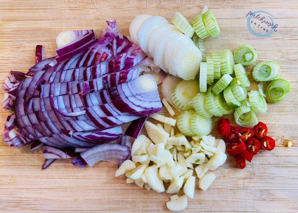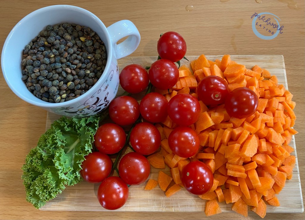 Dieses Linsenragout lässt sich sehr schnell und variantenreich zubereiten. Wenn ich nach dem Wochenende in den Kühlschrank schaue, sind immer Gemüsereste, wie z.B. eine halbe Zwiebel, zwei Karotten,…, vorhanden. Die restlichen Zutaten finden sich eigentlich in jedem Vorratsschrank.
