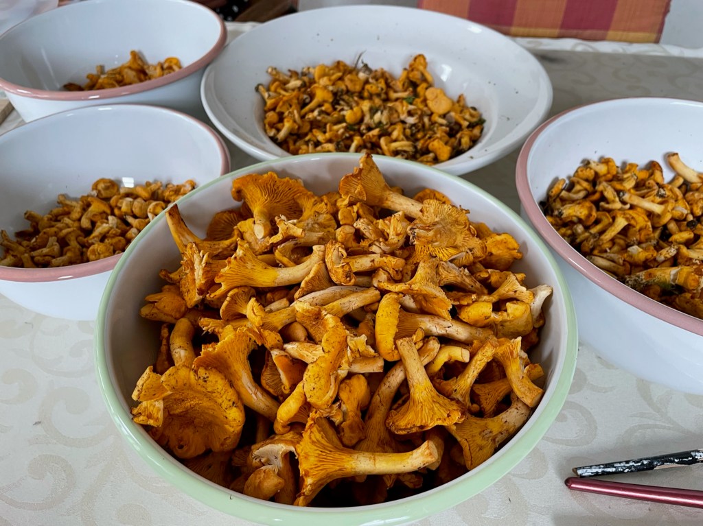 Für heuer ist mein Bedarf an Eierschwammerln gedeckt. Letztes Wochenende waren wir im Waldviertel und haben noch einmal Pilze gesammelt. Ich habe sie eingelegt, vorgegart und eingefroren. Es gab Schwammerlrostbraten, eine Frittata, eine Kartoffelsuppe mit Pilzen und aus dem Rest habe ich ein Risotto gemacht.