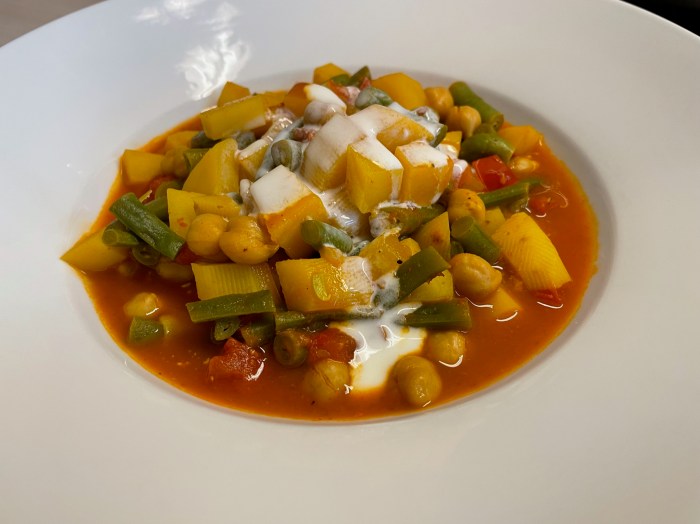Servieren und einen Löffel Joghurt über das Curry geben.